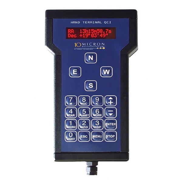 Operator interfaces: Control hand pad: the QCI system uses a ergonomic hand terminal to pilot the mount , to slew to objects, to set parameters, to sync. on a star , to set moving speeds. It is a numerical pad with rapid search keys, red illuminated display 2x 16 dots, that operated within a wide range of ambient temperatures : +40°C / –20°C . It’s a communication interface between the mount and the operator.