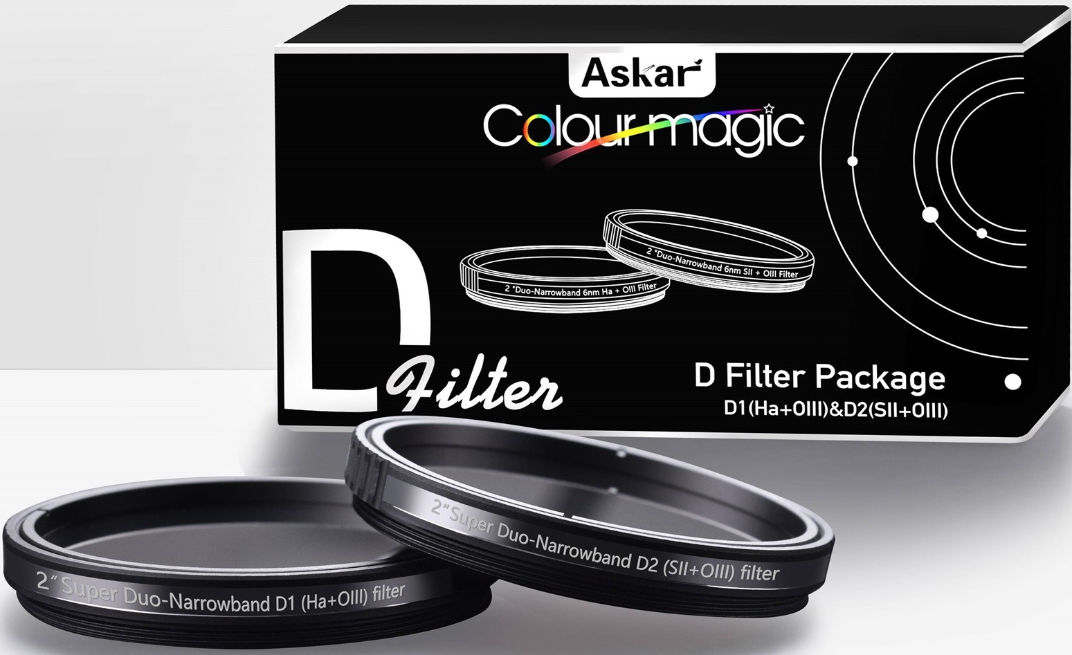 Deze Askar Colour Magic Super D Filter set 2 inch heeft een smalle bandbreedte. Zelfs als u zich in een gebied bevindt dat wordt beïnvloed door stedelijke lichtvervuiling, nachtgloed en ander ongewenst licht, kunt u hoogwaardige deepsky-foto’s maken met de hulp van Askar Super D Duo-smal band filters De smallere bandbreedte en efficiënte lichttransmissie verbeteren het contrast van uw foto’s aanzienlijk, waardoor het gemakkelijker wordt om de details van de sterren weer te geven die anders vrij moeilijk te herkennen zijn.