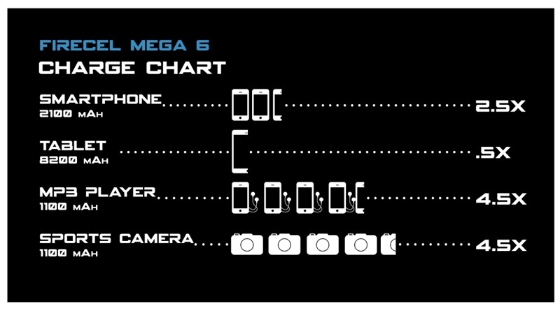 | Auto Charge Feature | Plug into the standard USB port and the FireCel Mega 6 will automatically start to charge your device |