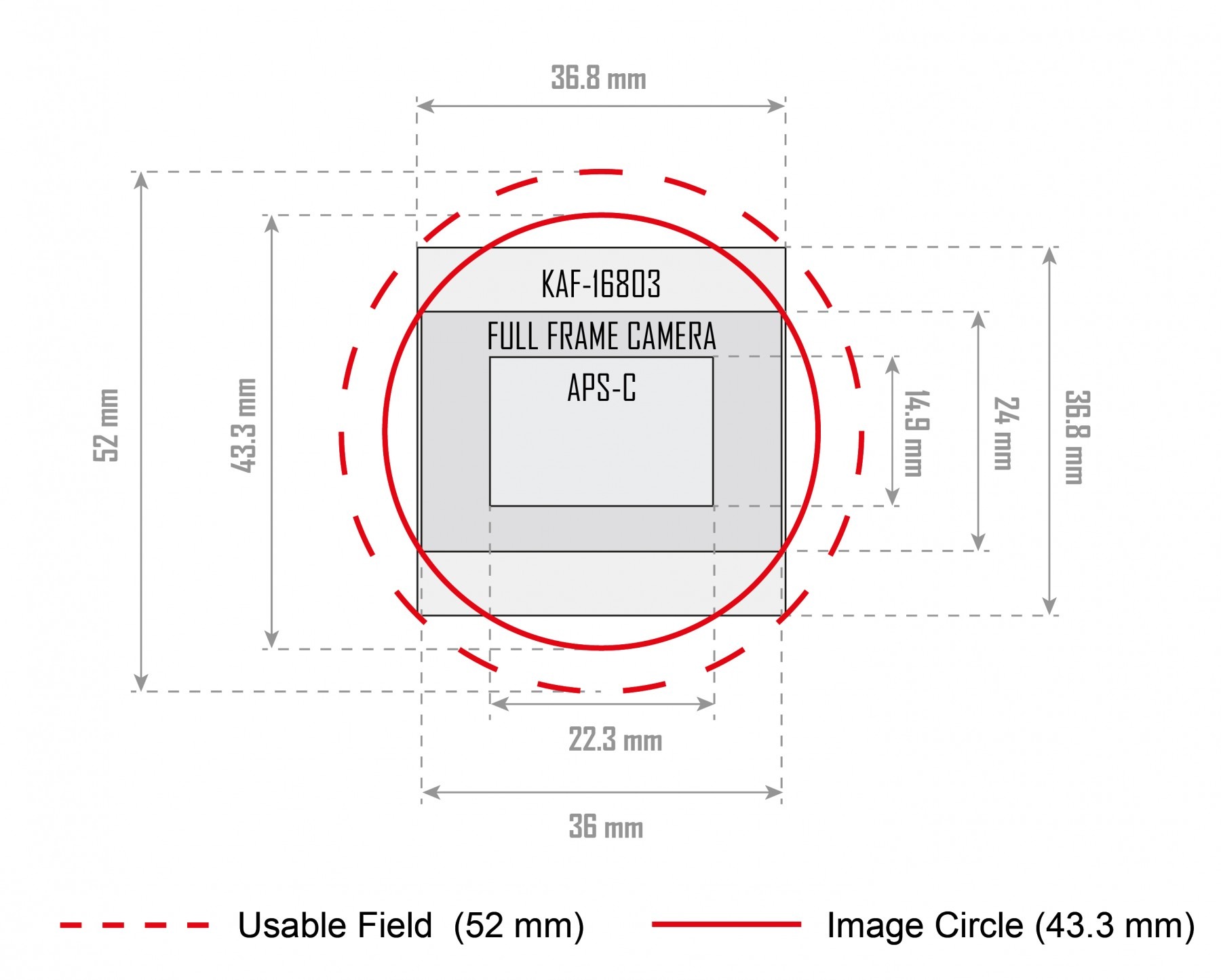 - Large 43.3mm optimized image circle maintains pinpoint stars to the far corners of even the largest astroimaging sensors, while the usable field extends even further to 52mm for larger format sensors