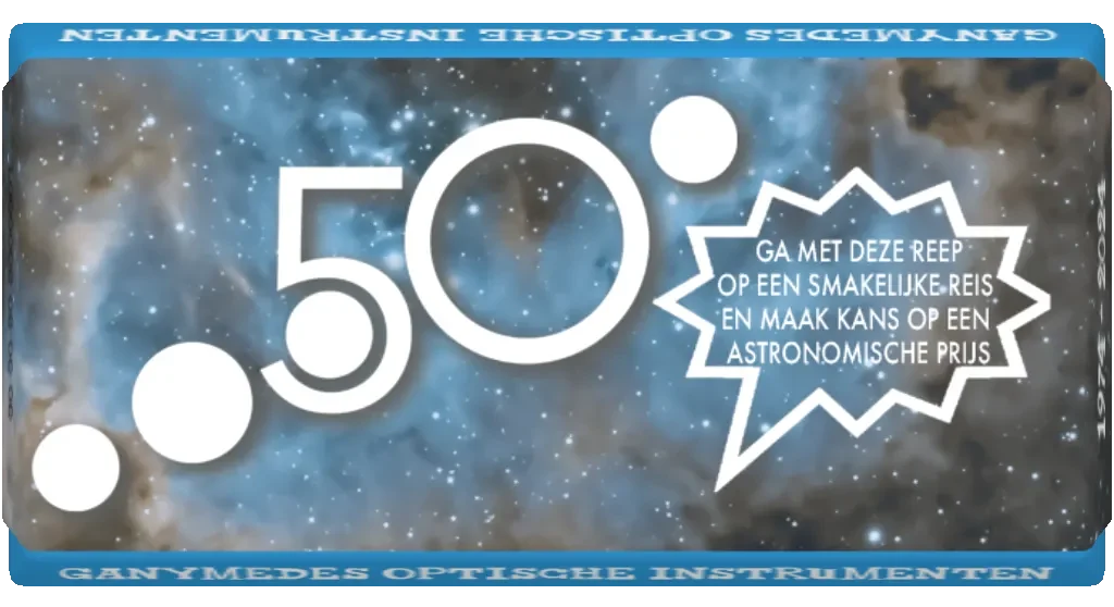 Ganymedes 50-jarig jubileum chocolade reep WIN ACTIE. Ga met deze reep op een smakelijke reis en maak daarmee kans op een astronomische prijs!