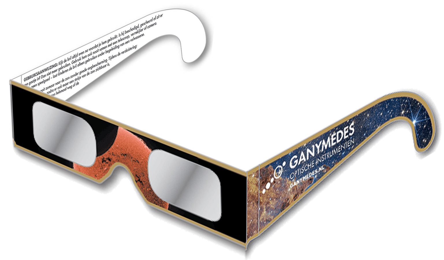 Een zonsverduistering is indrukwekkend, maar laat je niet verblinden: direct naar de zon kijken is zonder de juiste bescherming altijd schadelijk voor je ogen. Ook bij het waarnemen van zonnevlekken geldt: veiligheid eerst. Met deze speciaal ontwikkelde Ganymedes eclipsbril voor zonwaarneming kijk je veilig naar de zon. Het filter verzwakt het zichtbare licht en blokkeert tegelijkertijd de onzichtbare en bijzonder gevaarlijke UV- en infraroodstraling. Zo blijven je ogen volledig beschermd, terwijl jij comfortabel het fenomeen kunt volgen.