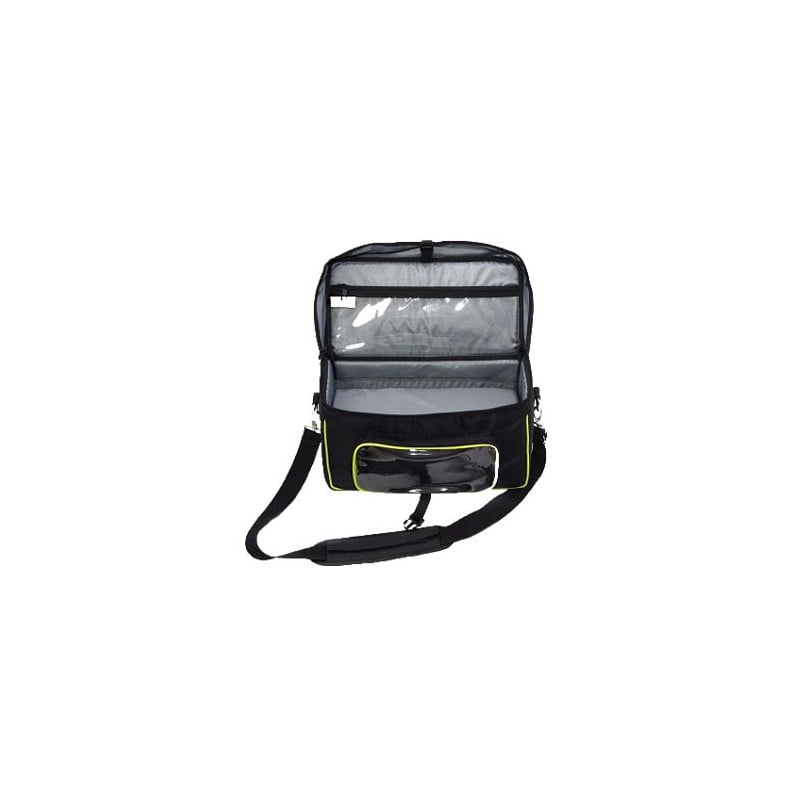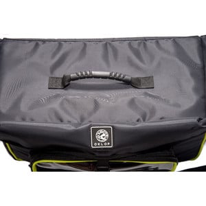 - handvat, schouderriem (met metalen karabijnhaak) en brede ritssluiting