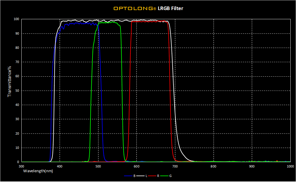 De LRGB filter set is ontworpen voor maximaal contrast en met extreem hoge gradiënten voor duidelijke kleurdifferentiatie. De LRGB filter set verdeelt het spectrum in zijn componenten Rood, Groen, Blauw en Luminantie. OIII-emissie overlapt blauwe en groene filters met maximale transmissie om hoge efficiëntie en natuurlijke kleurenweergave mogelijk te maken. De opening tussen groene en rode filters dient om de primaire natriumlichtvervuilingslijn bij 589 nm te blokkeren en verbetert de kleurbalans en scheiding.