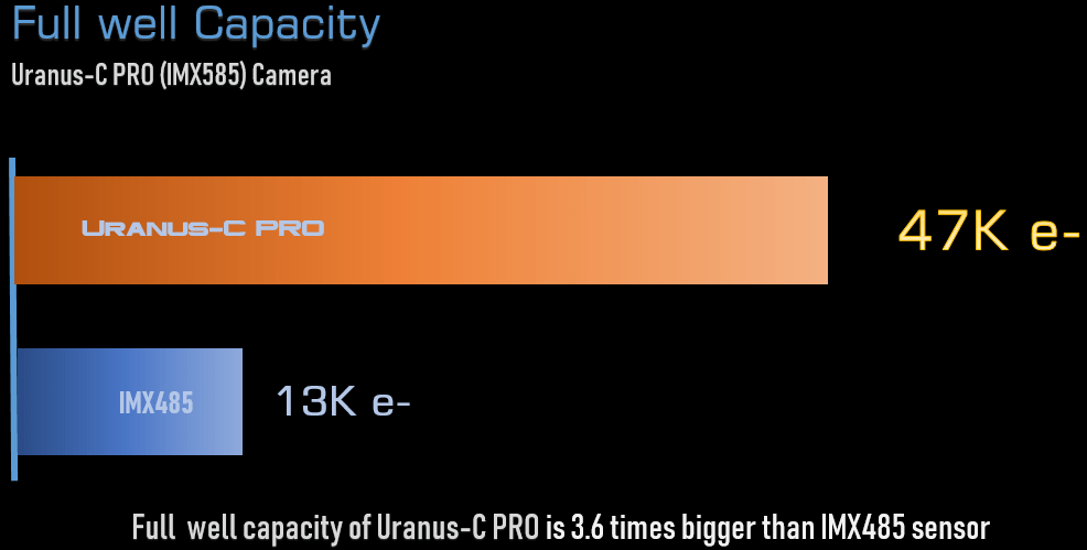 Uranus-C Pro (IMX585) camera is ontwikkeld door Player One Astronomy, het is de eerste IMX585 gekoelde camera ter wereld. Uranus-C Pro-camera, die gebruik maakt van de Sony IMX585 1/1.2 inch-formaat kleurensensor. De pixelgrootte van 2.9um biedt plaats aan een putdiepte van 47Ke met een totaal van 8,3 MP (de resolutie is 3856*2180) en de diagonaal is 12.85 mm.
