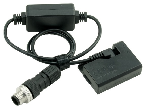 Deze Eagle-compatibele voedingskabels hebben aan de ene kant de valse batterij die op de DSLR wordt aangesloten in plaats van de standaardbatterij. Aan de andere kant hebben ze de stekker met schroefaansluiting om te voorkomen dat ze per ongeluk worden losgekoppeld van Eagle. In het midden bevindt zich een spanningsregelaar die het vermogen omzet in de spanning die de geselecteerde camera nodig heeft.