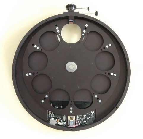 The ‘Maxi’ filter wheel is ideal for use with larger format cameras, as it has the ability to carry up to 7 x 2 inch square filters, or 9 x 2 inch round filters. It also has a large input / output aperture of up to 65mm clear diameter (72mm x 1mm threads). The built-in off-axis guide assembly makes it easy to use with most guide cameras (Lodestar X2 recommended).