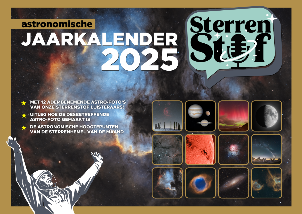 Deze kalender voor 2025 is gemaakt met 12 adembenemende astro-foto’s van SterrenStof luisteraars met uitleg hoe de desbetreffende astro-foto gemaakt is. Deze kalender geeft daarnaast een uitgebreid overzicht van alle hemelverschijnselen die in een jaar worden verwacht. Zoals de posities van zon, maan, planeten, planetoïden, kometen en meteoren.