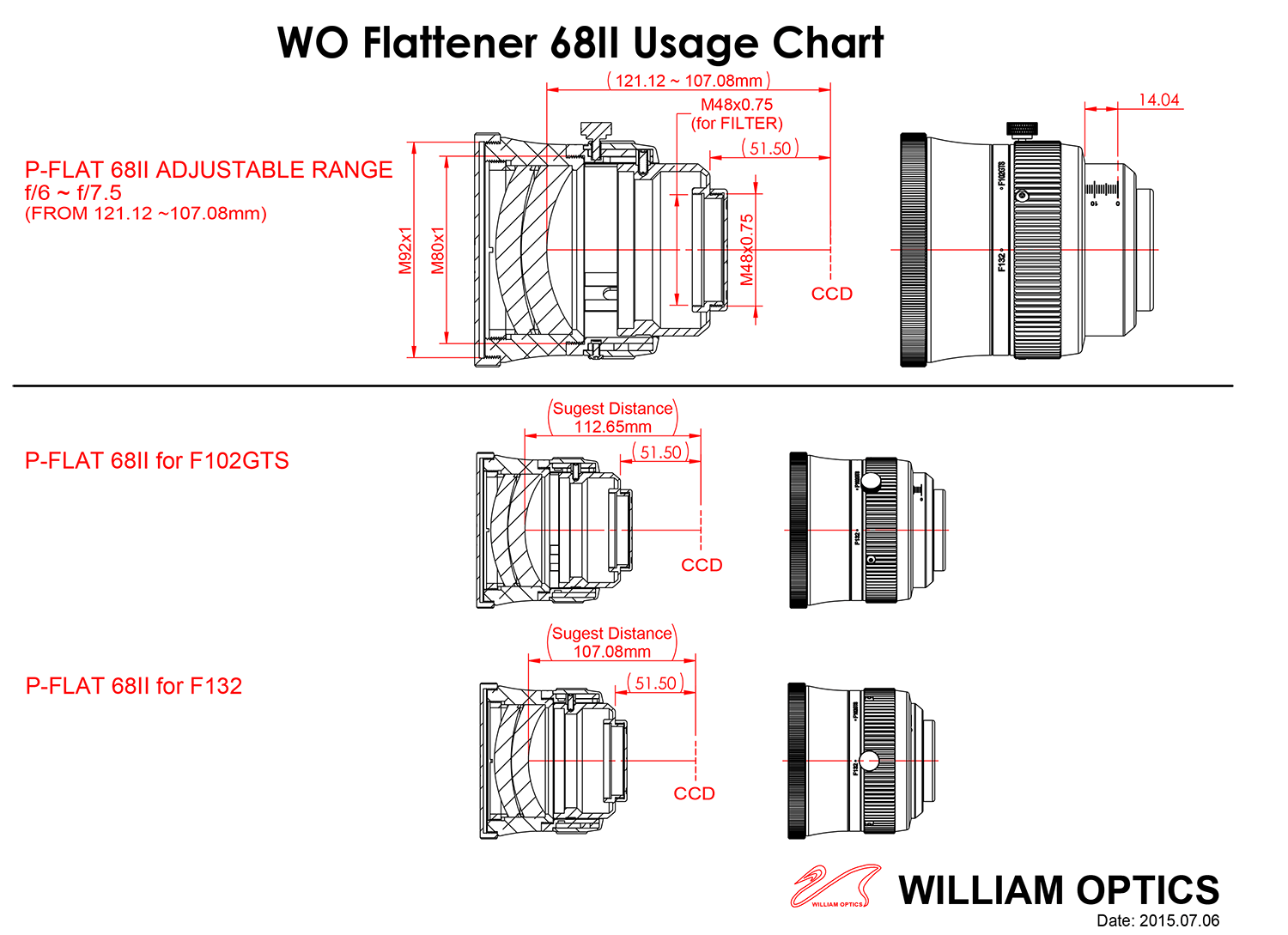 Deze revolutionaire nieuwe WO FF68II verstelbare flattener is gemaakt voor refractors met een verhouding van 6 -7,5 F. De hoogwaardige flattener is CNC-gefreesd en ontworpen voor het gebruikt met de volgende William Optics telescopen:
