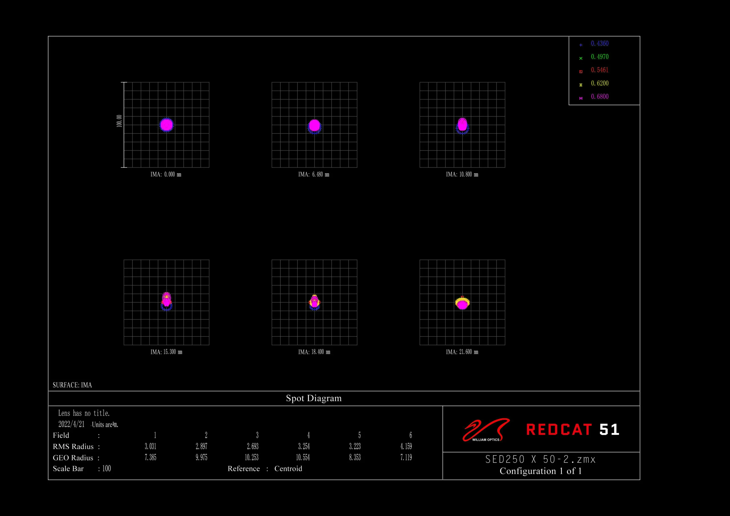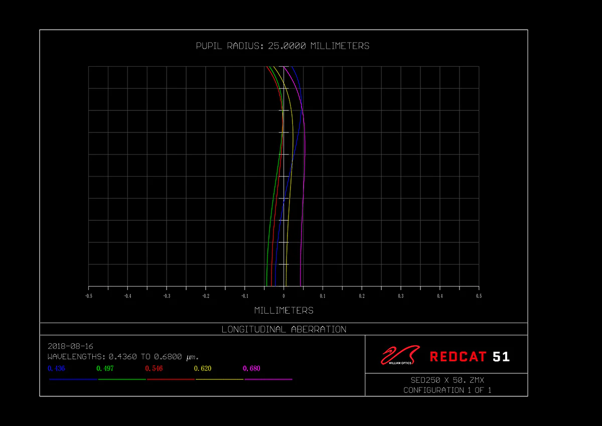 Het lens systeem bestaat uit 4 elementen en is een zogenoemde Petzval ontwerp. Lens wordt beschermd door een lens dop met daarin een Bahtinov mask verwerkt. Hiermee kan je eenvoudiger scherpstellen. Omdat de scherpstelling intern in de telescoop buis heeft William Optics er wel voor gezorgd dat er een schaalverdeling is ingegraveerd.