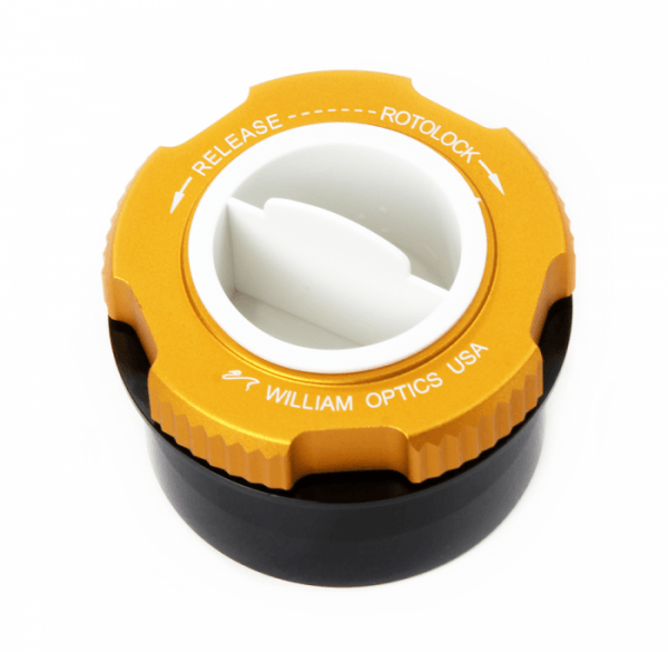 William Optics RotoLock adapter 1 25 inch Goud met een 2 inch mannelijke inschuif vatting met filterdraad.
