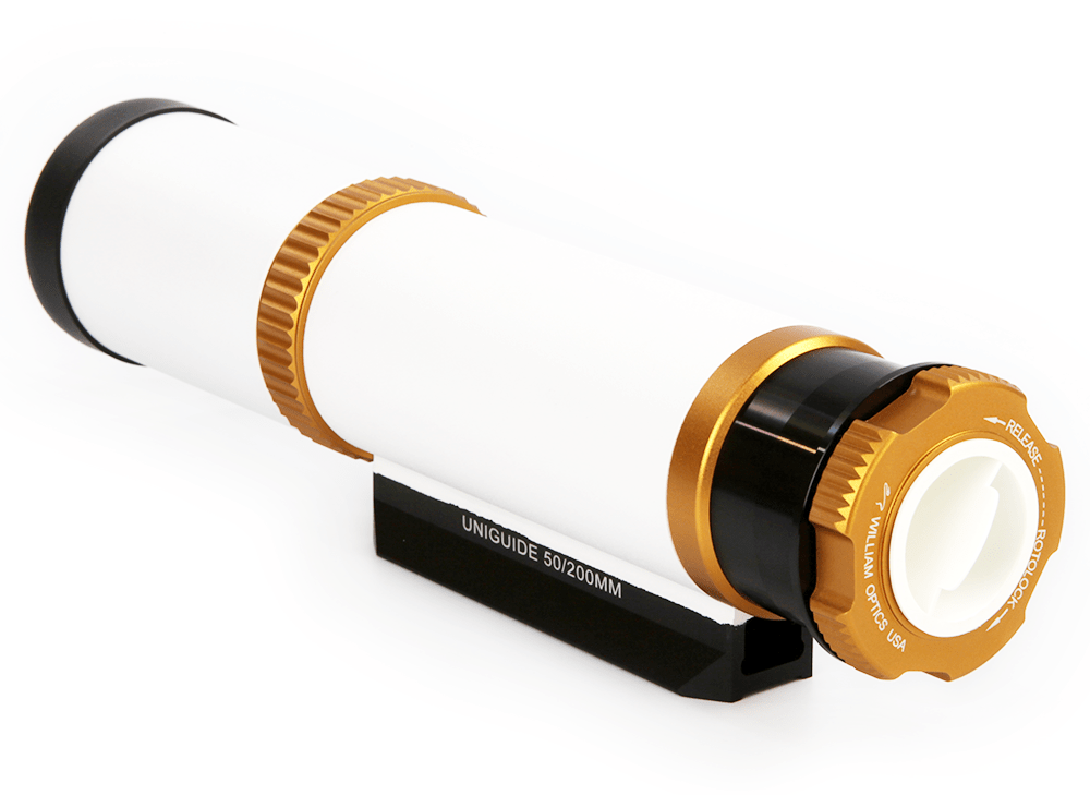 William Optics UniGuide Goud 50mm met een brandpunt van 200 mm. Voorzien van een 1.25 inch Roto lock adapter. In een handomdraai je guide camera vastzetten.