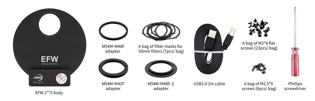 Delivery of the ZWO EFW Electronic Filter Wheel 7×2″ includes: